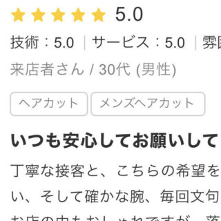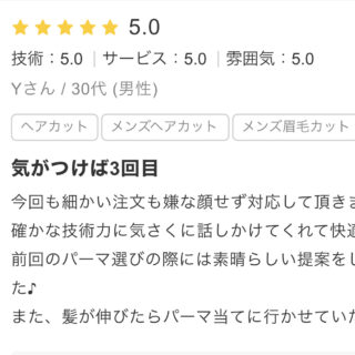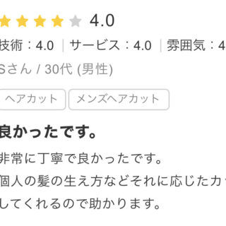 非常に丁寧で良かったです。 個人の髪の生え方などそれに応じたカット及びセット方法を提案してくれるので助かります。