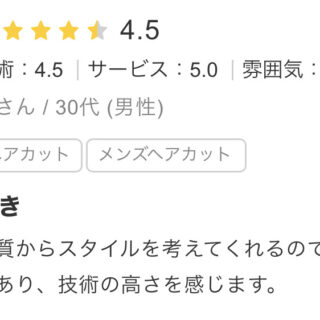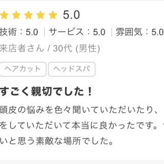 すごく親切でした! 頭皮の悩みを色々聞いていただいたり、自分にあった髪型の提案をしていただいて本当に良かったです。1回行ったらまた行きたいと思う素敵な場所でした。