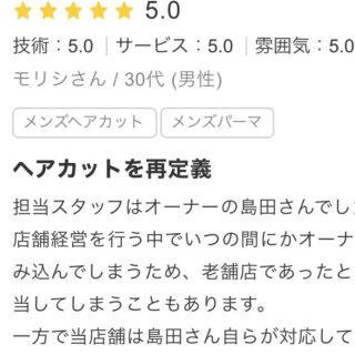 ヘアカットを再定義 担当スタッフはオーナーの島田さんでした。美容院や理髪店は多店舗経営を行う中でいつの間にかオーナーは経営のほうに足を踏み込んでしまうため、老舗店であったとしても若いスタッフが担当してしまうこともあります。 一方で当店舗は島...